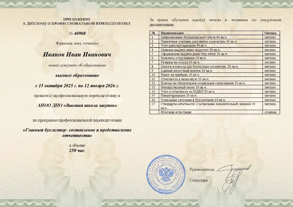 Профессиональная переподготовка. 256 академических часов, 8 модулей: постановка и ведение учета по общей системе налогообложения, налоги (НДС, налог на прибыль, НДФЛ) и страховые взносы, учет активов и расчетов, кадровый учет и расчет зарплаты, бухгалтерская и налоговая отчетность, планирование и внутренний контроль. Онлайн-обучение в в Пскове с итоговой аттестацией.