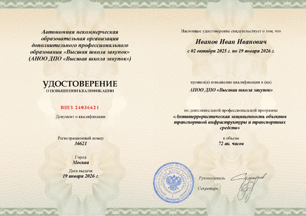 Повышение квалификации, 72 академических часа, 7 модулей: нормативно-правовые основы и угрозы в сфере образования, обязанности ответственных лиц, инженерно-техническая укрепленность объектов, анализ уязвимости, документооборот и действия персонала при ЧС. Онлайн-обучение в в Пскове с итоговой аттестацией.