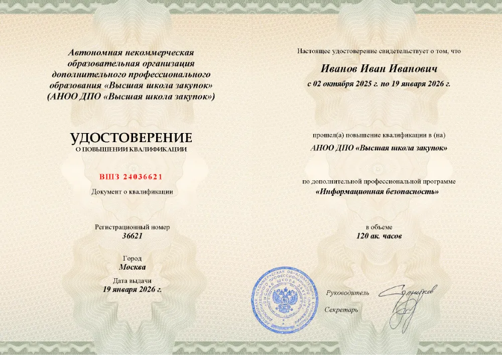 Повышение квалификации, 120 академических часов, 17 модулей: понятие, угрозы и законодательство в сфере ИБ, стандарты и управление рисками, административные и технические меры защиты, криптография, идентификация и обеспечение доступности. Онлайн-обучение в в Пскове с итоговой аттестацией.