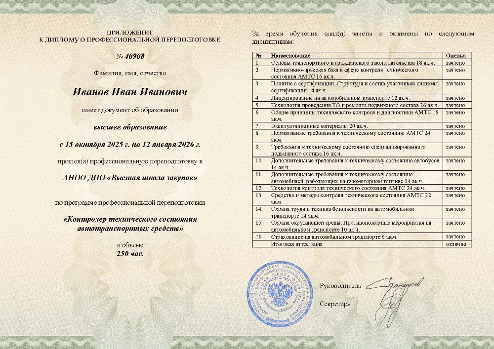 Профессиональная переподготовка, 250 академических часов, 7 модуля: нормативно-правовые основы и технологии контроля, охрана труда, экологии и требования к техническому состоянию транспортных средств. Онлайн-обучение в в Пскове с итоговой аттестацией.